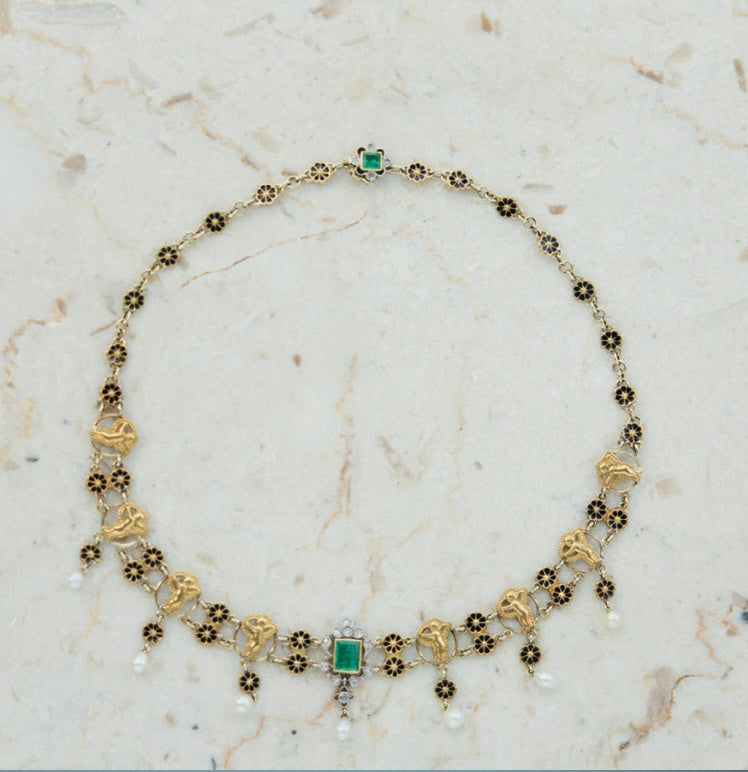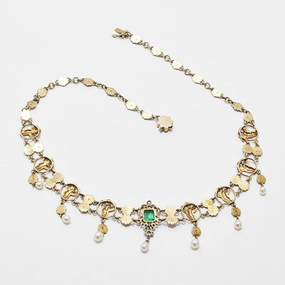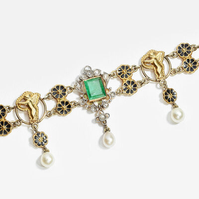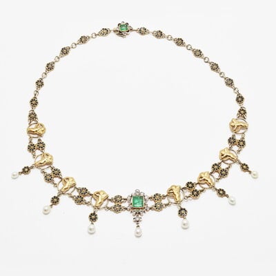 Set with two emeralds 4.5 - 4.0 mm and 15 rose-cut diamonds. Seven joints depicted as little cupids Sew with natural pearls as a pendant. Four roses in the lock.